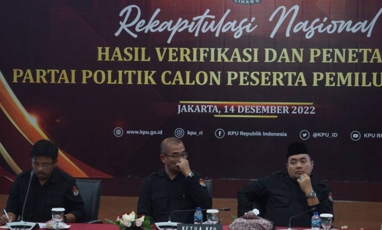 “Memutuskan menetapkan keputusan KPU tentang penetapan partai politik peserta pemilu anggota DPR dan DPRD dan parpol lokal Aceh … menetapkan 17 partai politik sebagai peserta pemilu DPR, DPRD, Tahun 2024,” jelas Ketua KPU Hasyim Asy’ari dalam Rapat Pleno Penetapan Partai Politik Peserta Pemilu 2024.
