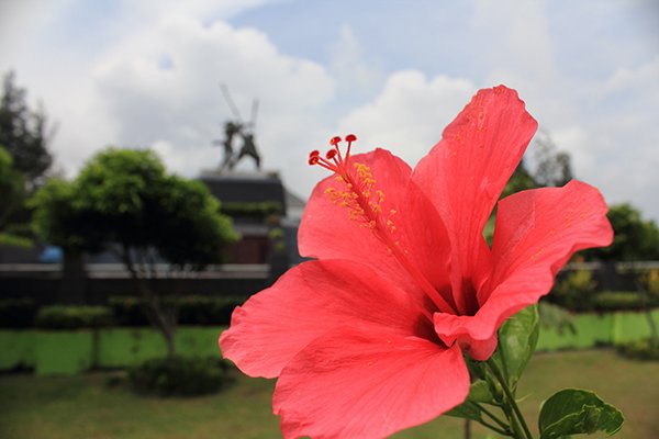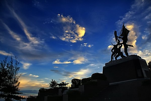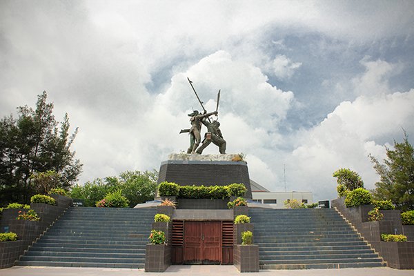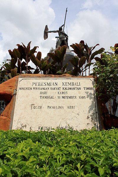 Tiga patung pejuang dengan senjata berbeda; mandau, talawang (perisai Dayak), bambu runcing dan senapan, tampak mengibarkan bendera yang sudah koyak. Patung inilah yang menjadi ikon Monumen Perjuangan Rakyat (Monpera) Balikpapan. Tiga patung pejuang itu menggambarkan bersatunya masyarakat dari berbagai latar belakang untuk melawan imperialis.